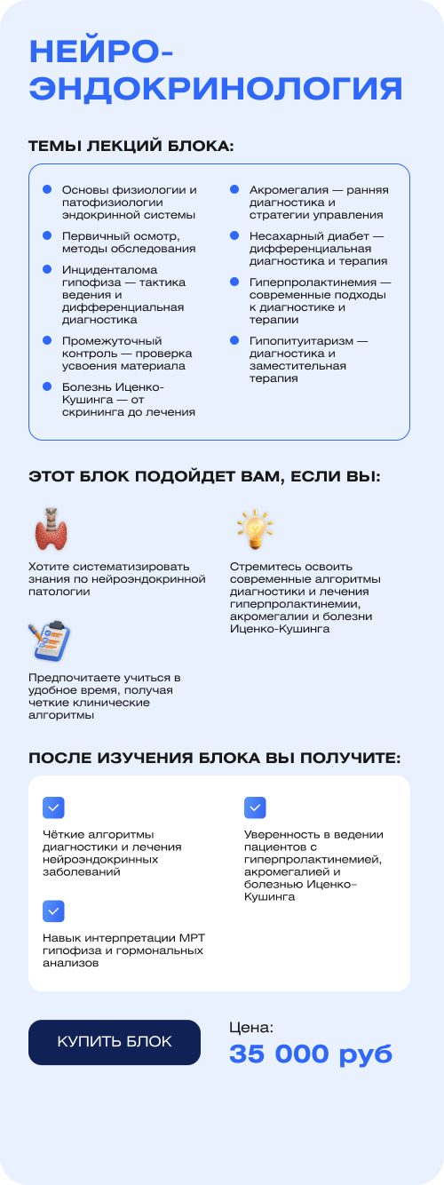 - Стремитесь освоить современные алгоритмы диагностики и лечения гиперпролактинемии, акромегалии и болезни Иценко-Кушинга