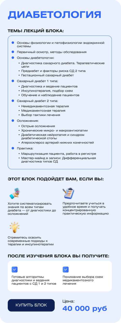 - Хотите систематизировать знания по всем типам диабета — от диагностики до осложнений