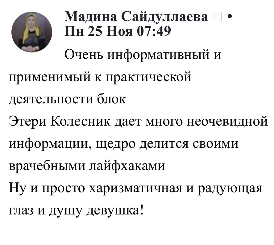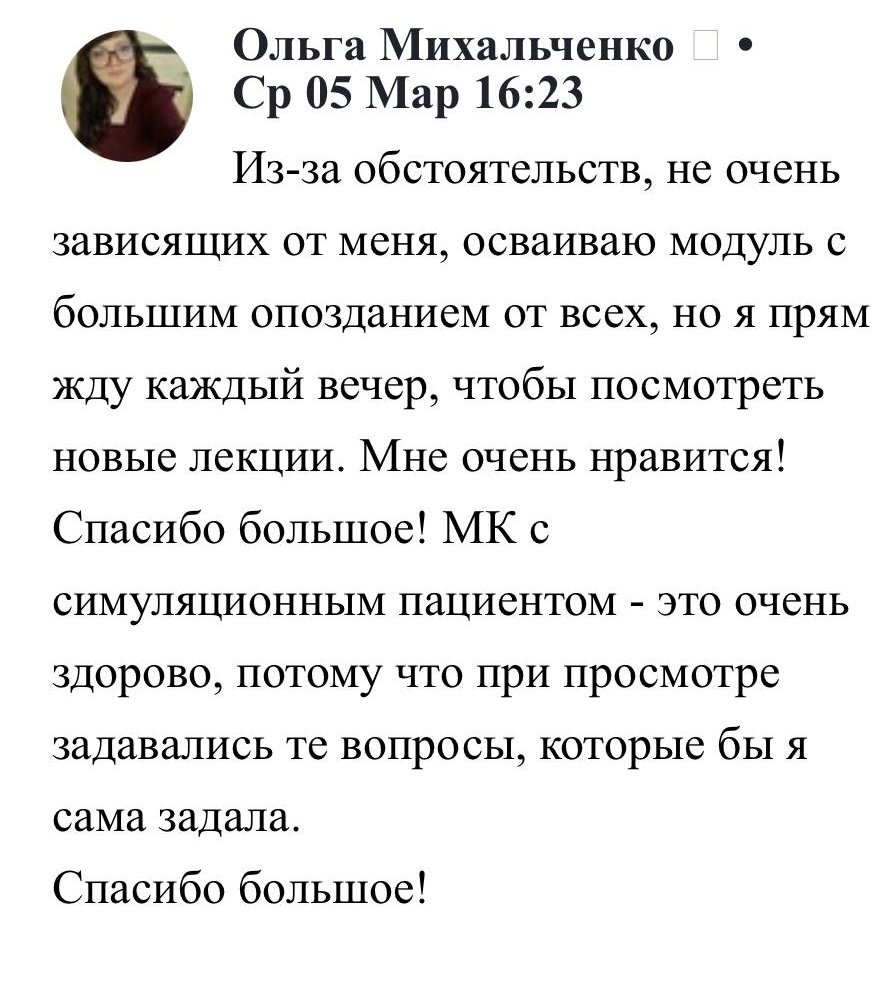 - Получаете поддержку и обратную связь от кураторов в чате Во время обучения Вы можете задать любой вопрос в рамках темы или обсудить интересный случай