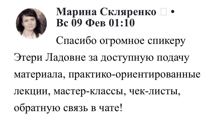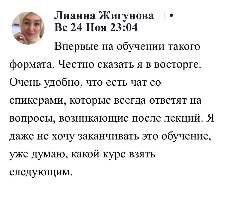 - Получаете обратную связь от преподавателей в чате и на живых мастермайндах После каждого блока обучения вопросы можно задать на мастермайнде с преподавателем или в текщем режиме в чате обучения